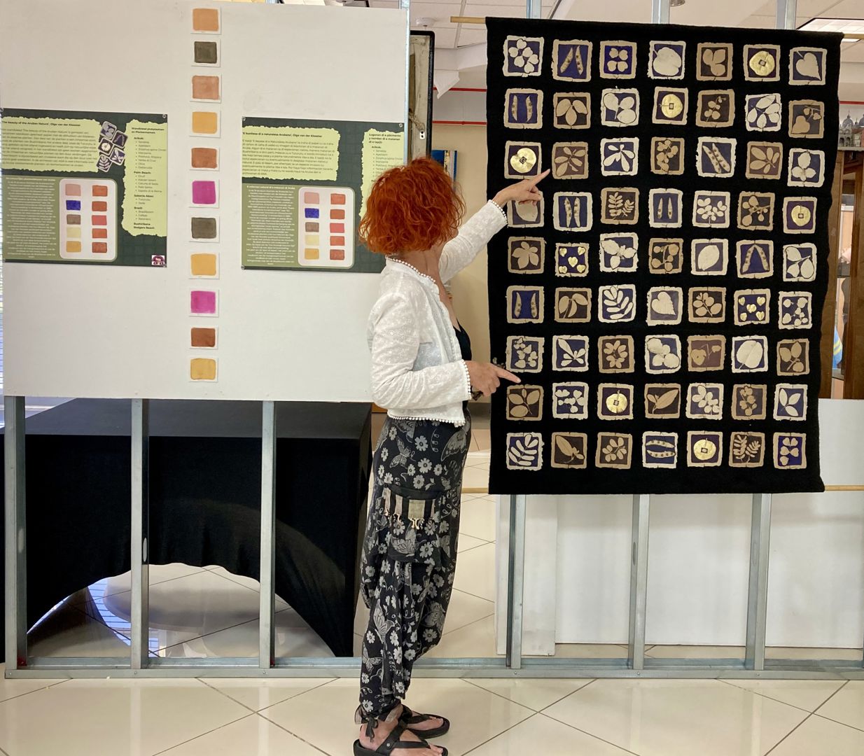 Over de foto Je ziet hier meerdere facetten van mijn werk: de resultaten van historisch onderzoek naar Van Koolwijk en zijn Caribische erfgoed collectie. Op grond van de plantenlijst die hij samenstelde reconstrueerde ik de kleurstoffen (zie de kleurstaal). Van de inheemse plantensoorten die hij inventariseerde maakte ik kunst in de vorm van blinddrukken van bladeren en peulen op zelf geschept papier gemaakt van eierdozenpulp. Het zwart is toegevoegd om de bladeren te accentueren. De opvallende roze kleur in het midden van de kleurstaal is van verfhout of Brazilhout. Ik mocht een tak van die boom afzagen in iemands tuin.